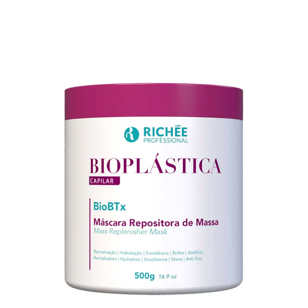 A Máscara Capilar Repositora de Massa Bioplástica BioBTx da Richée, e perfeita para revitalizar os fios danificados e porosos, deixando os cabelos mais nutridos com um brilho intenso, hidratando e uniformizando as cutículas, lidando também com a sedosidade do cabelo. A bioplástica presente age no cabelo como plástica para os fios que ajuda a conservar as fibras de colágeno e promove mais resistência aos fios.nbsp;nbsp;